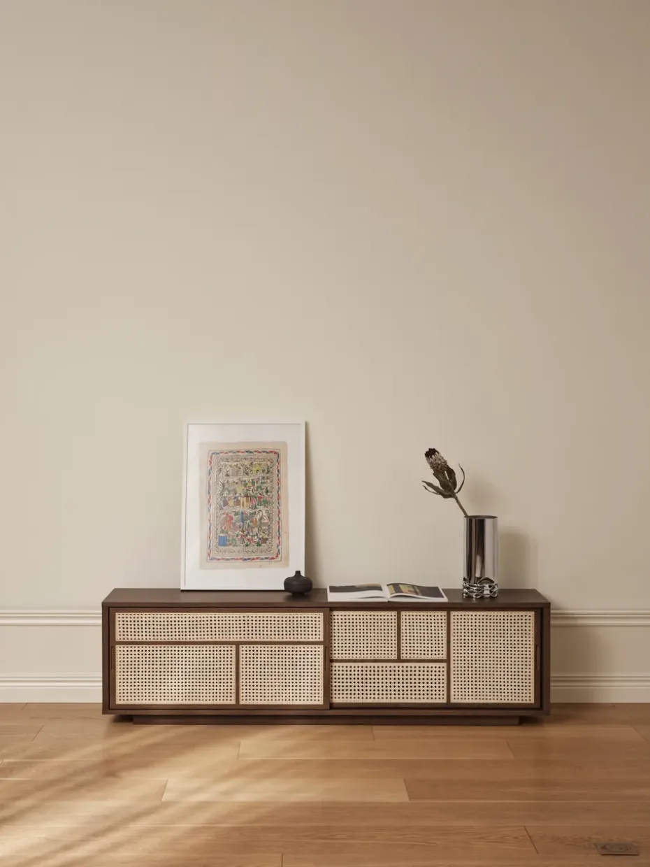 - Materiales: Materiales: MDF, poliuretano, chapa de roble, roble, ratánAcabado: Lacado