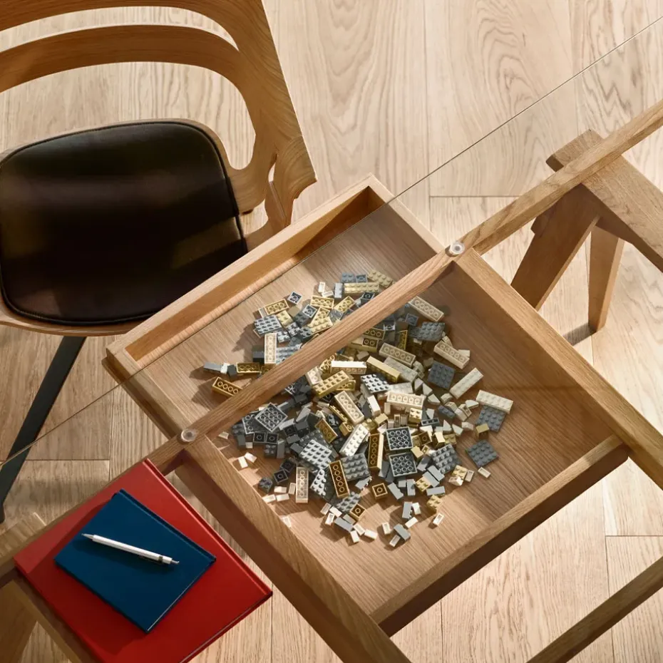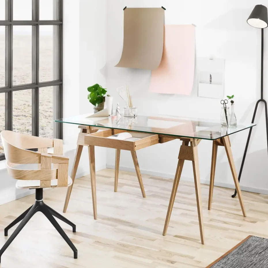 - Materiales: Tablero de mesaVidrioSoporteMateriales: RobleAcabado: Lacado